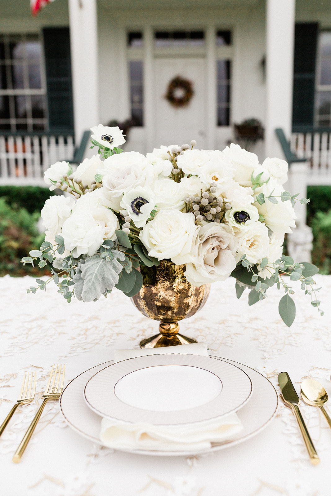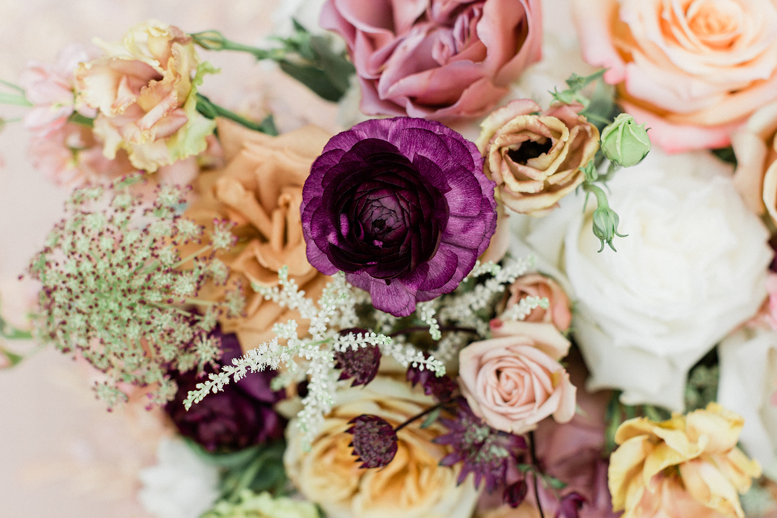 Autumn Days call for richer hues when it comes to nuptial celebrations. Here Babin chose plum and peach tones for the roses, ranunculus, astrantia, and Amnesia garden roses. She tempered this with a bone-colored tablecloth with dainty details all its own.