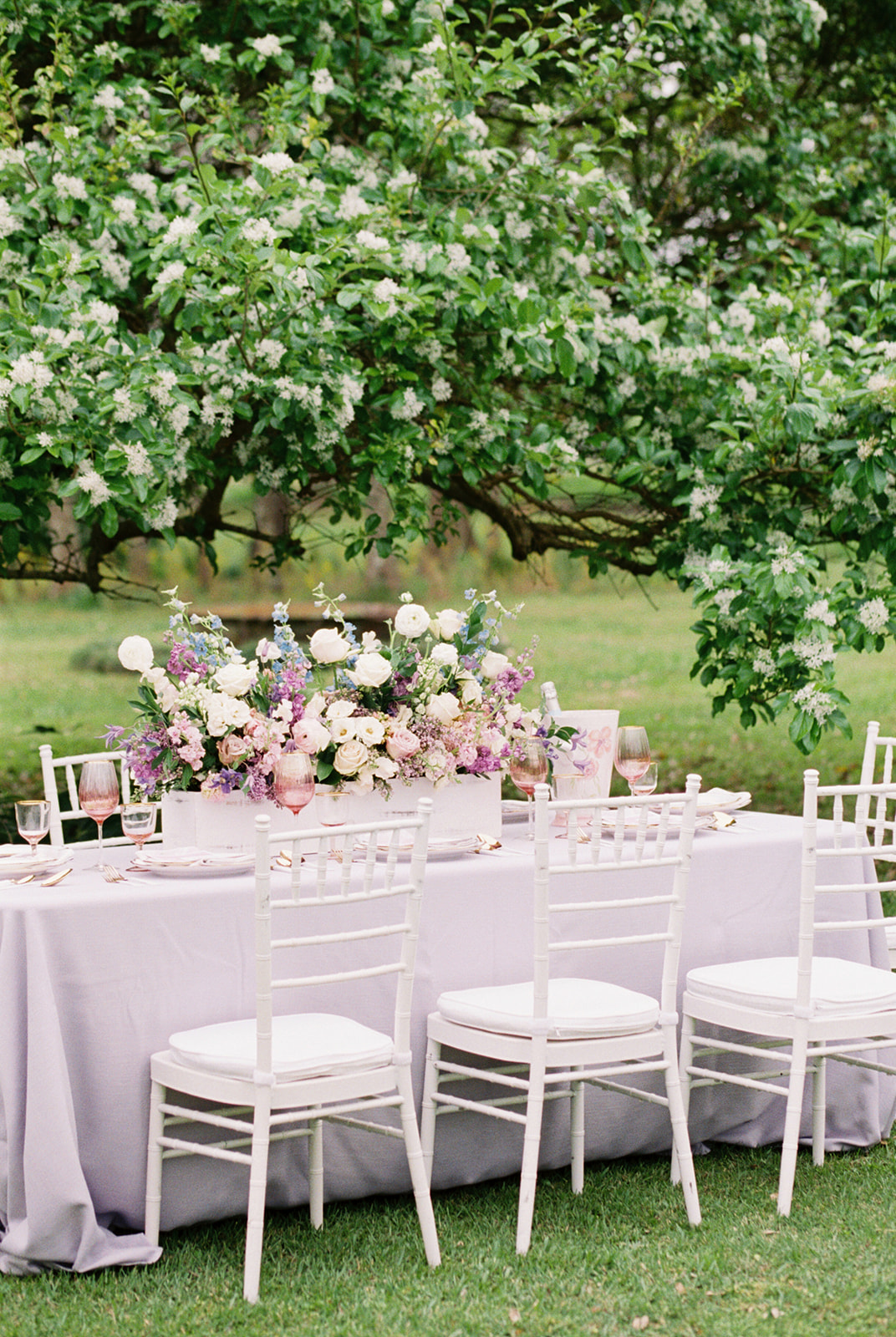 Florals explode out of a weathered box at the center of this serene al fresco event. Spring is the optimal time to have garden parties and outdoor weddings. And these roses, sweet peas, delphineums, hyacinths and lilacs sweeten the scene even more.