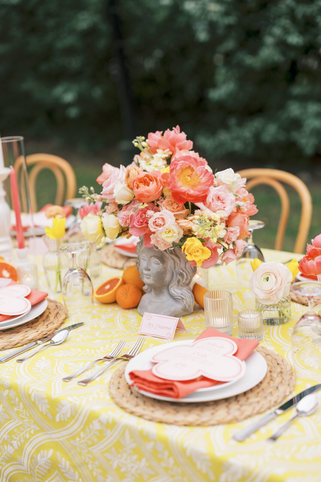 Rather than relinquish all control, Angela advises brides to join forces with the groom’s family in order to make decisions that benefit everyone. For example, floral arrangements used for the rehearsal, if in keeping with the wedding vision, can be reused the following day, preventing floral waste and saving money on wedding-day flowers. In Maggie and Caleb Passman’s Italian-inspired rehearsal pictured here, table arrangements were reused the next day on the reception bars.