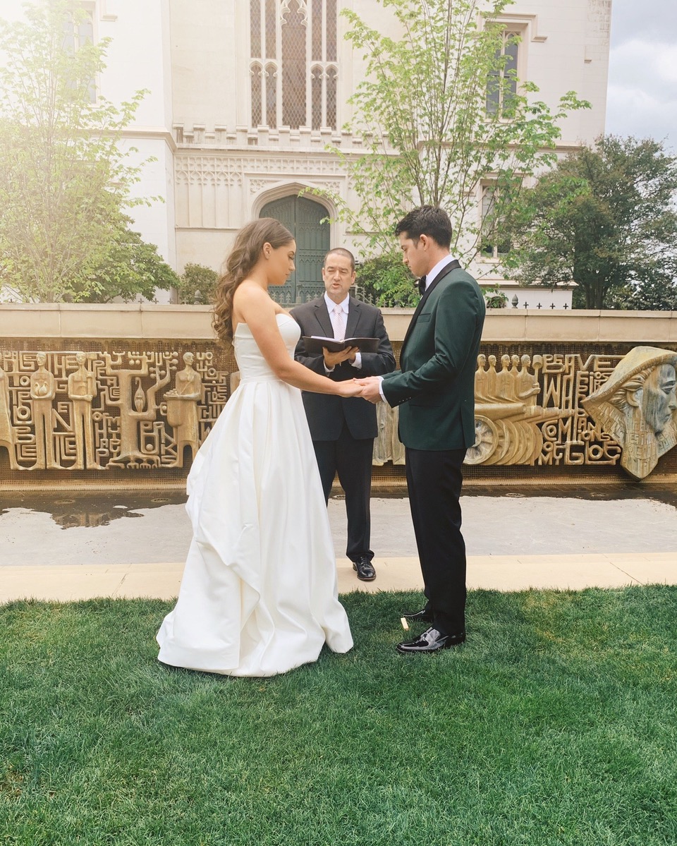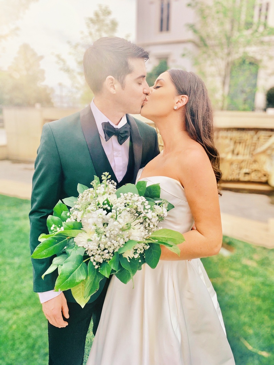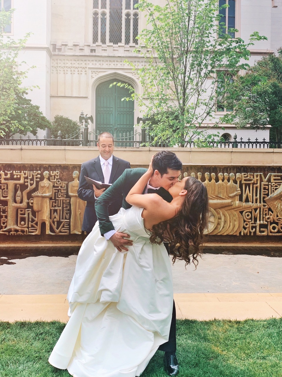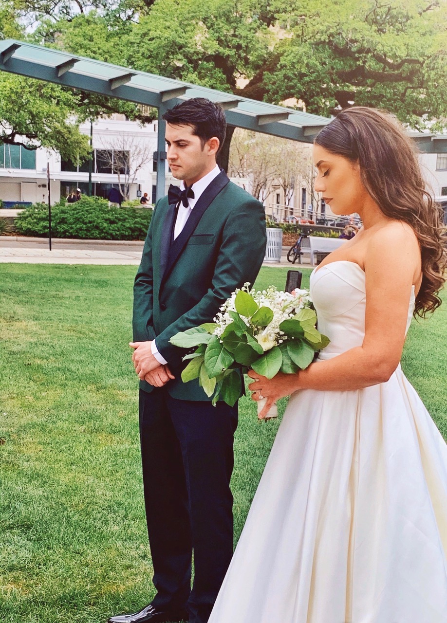 “We were determined to be married so we came to the conclusion of having a Zoom wedding,” says Haley. “We found a gorgeous public area between the Old State Capitol and City Hall and got married in front of a little fountain. Our wedding day was incredibly special, intimate and perfect.”