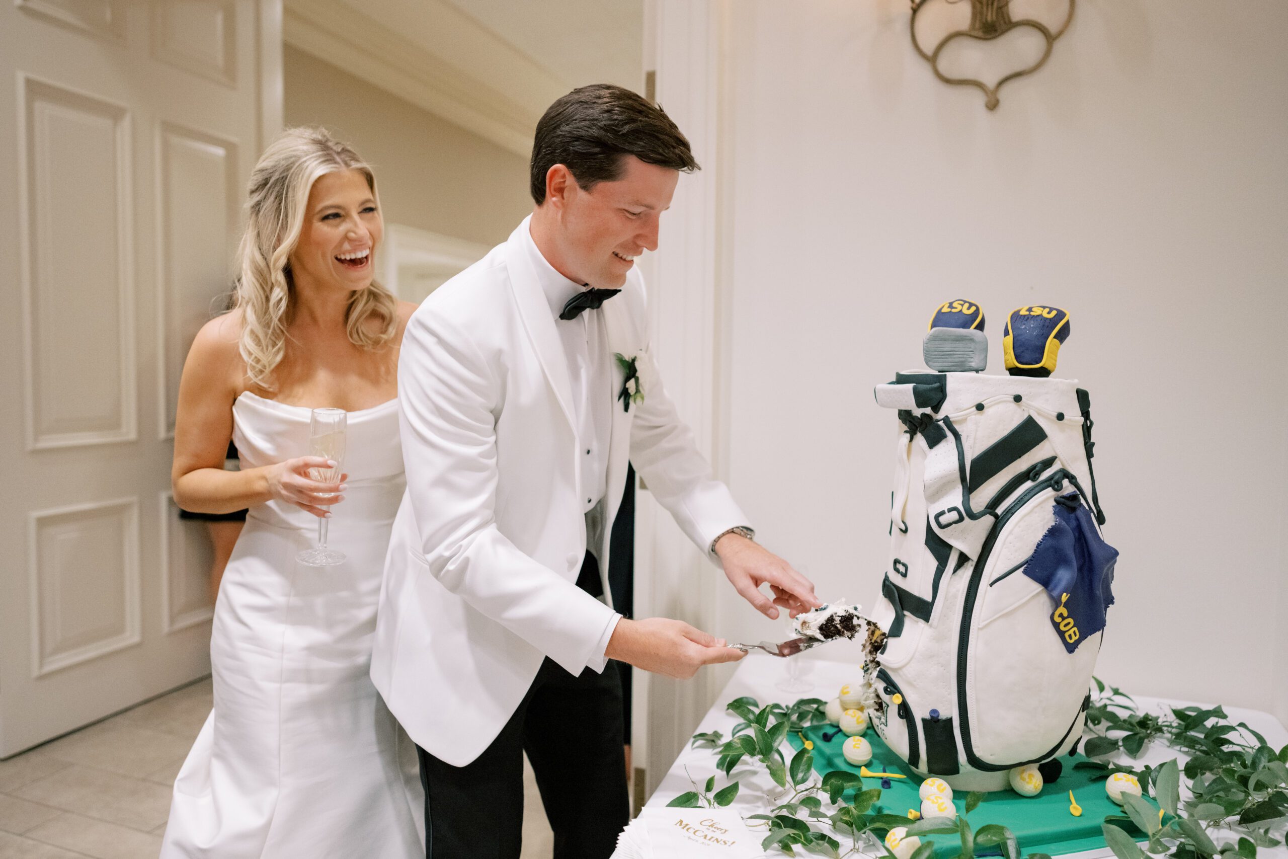 A: My groom’s cake. Elizabeth gave me a new golf bag as a wedding gift and then surprised me with a groom’s cake that was an exact replica of the bag.