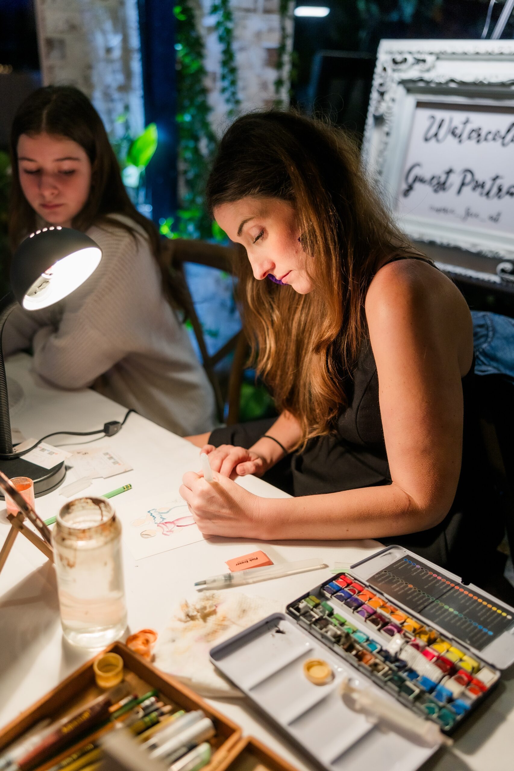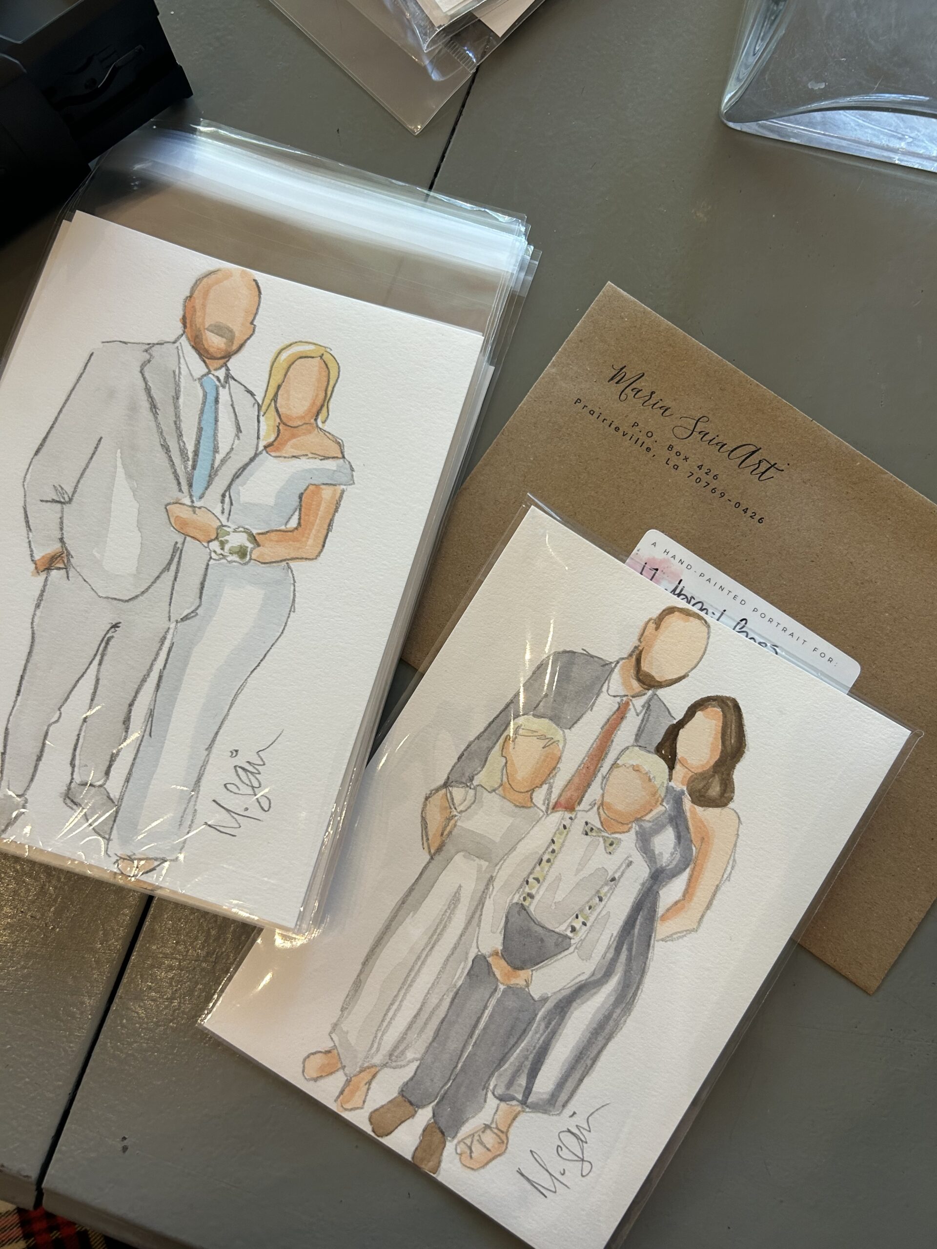 I offer an unlimited number of watercolor paintings per event. People come up, I snap their photos, and then start painting. I do as many as I can at the wedding, finish the rest from my studio, and mail them afterward. I can typically paint 14 portraits per hour, so each portrait can contain anywhere between 1 and 4 people.