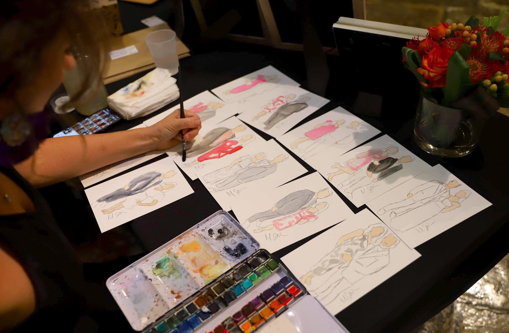 Wedding painting is a form of entertainment and a keepsake for the couple. Some of my favorite conversations have been with grandparents and kids at the wedding. They will come up throughout the night and ask questions about the single canvas painting of the bride and groom. People also love the watercolor paintings of the wedding guests and get so excited when I notice their shoes or their purse. It really helps the guests feel seen. It’s a party favor people will never forget.