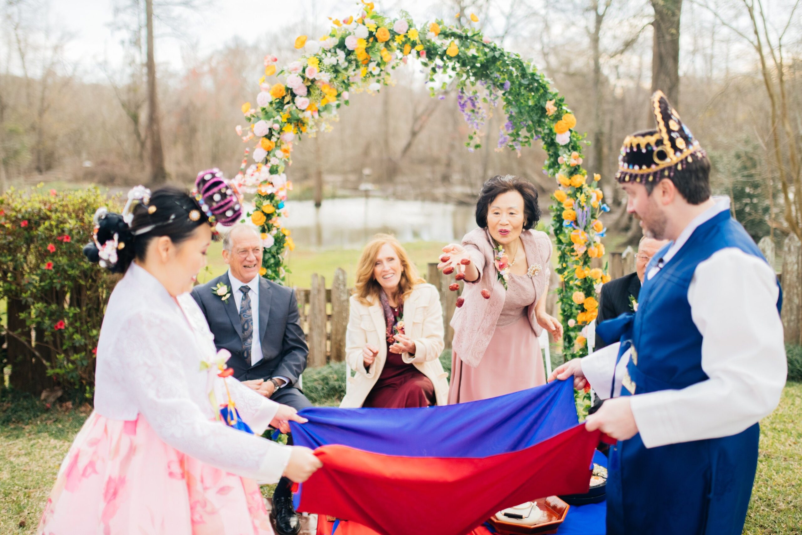 The catching of dates and chestnuts: The bride and groom will extend a long apron and the parents toss dates and chestnuts to the couple. The number of dates and chestnuts the happy couple catch in the cloth represent the number of children they will have, with dates representing sons, and chestnuts representing daughters. (“I believe we caught 24,” Kim recalls. “Yikes!”)